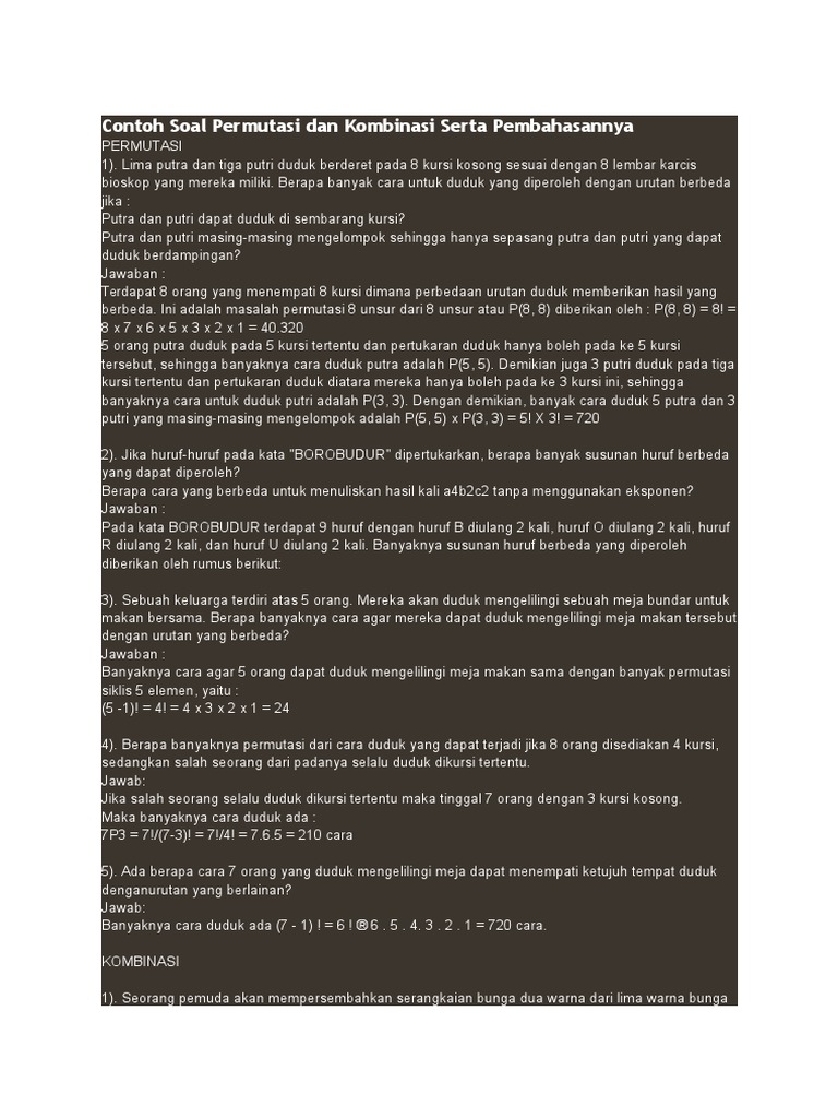 Contoh Soal Permutasi Dan Kombinasi / Contoh Soal Permutasi Dan Kombinasi Beserta Jawabannya Dan ... : We did not find results for:. Contoh soal permutasi dan kombinasi. We did not find results for: Maybe you would like to learn more about one of these? Check spelling or type a new query.
